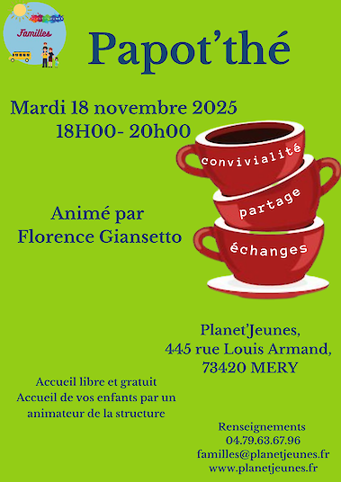 Le Papot'thé c’est un lieu convivial, de détente et d’échanges. Vous pouvez venir y discuter de vos préoccupations familiales autour d’un café ou d’un thé. Florence sera présente pour vous accueillir et vous accompagner.